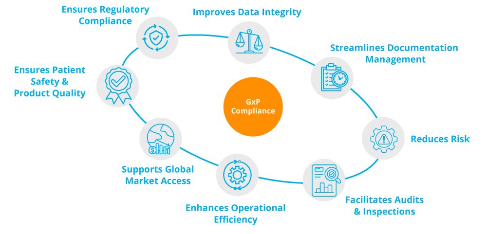 Ensures Regulatory Compliance –GxP guidelines (e.g., Good Manufacturing Practice (GMP), Good Laboratory Practice (GLP), and Good Clinical Practice (GCP)) are designed to ensure product safety, efficacy, and quality. GxP compliance software helps organizations meet the requirements of regulatory bodies including the FDA, EMA, or WHO by streamlining processes, maintaining accurate records, and enabling efficient audits.
