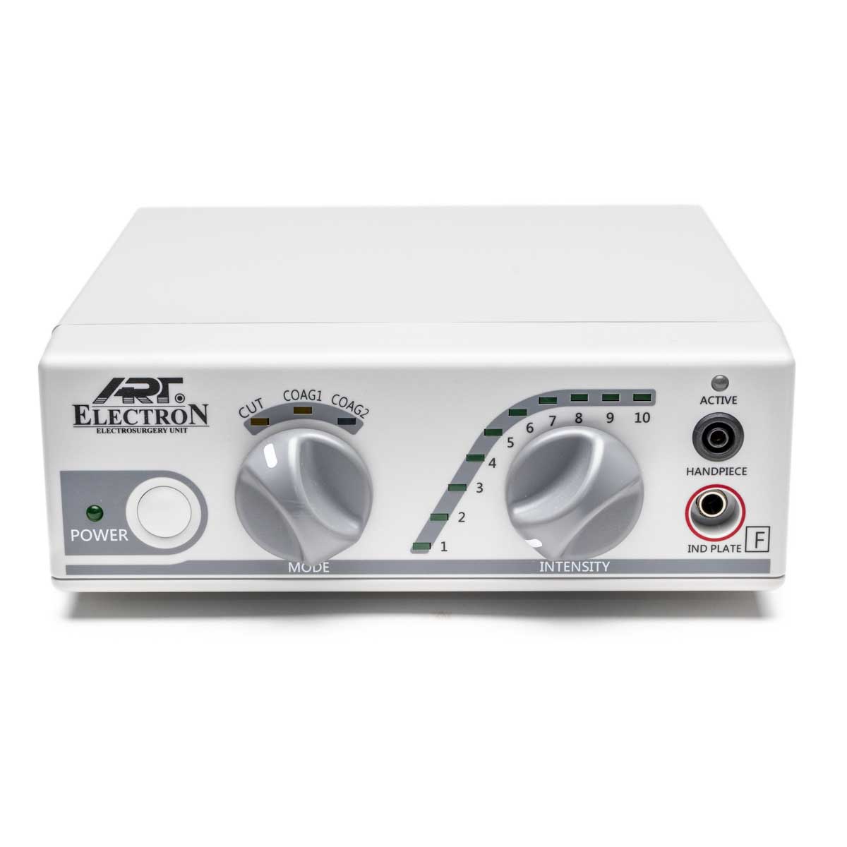 Electrosurgery utilizes alternating current at radio frequencies to cut and coagulate. Using this method, the current enters the subject's body and the subject becomes part of the electrical circuit. This requires the use of a return, or ground, plate. This economically priced electrosurgical unit has 10 levels of output intensity, three operational modes (cut, coagulate, and cut/coagulate) and various choices of electrodes. The unit comes complete and ready-to-use with a handpiece, ground plate, foot switch and one of each electrodes. All accessories can also be ordered separately.