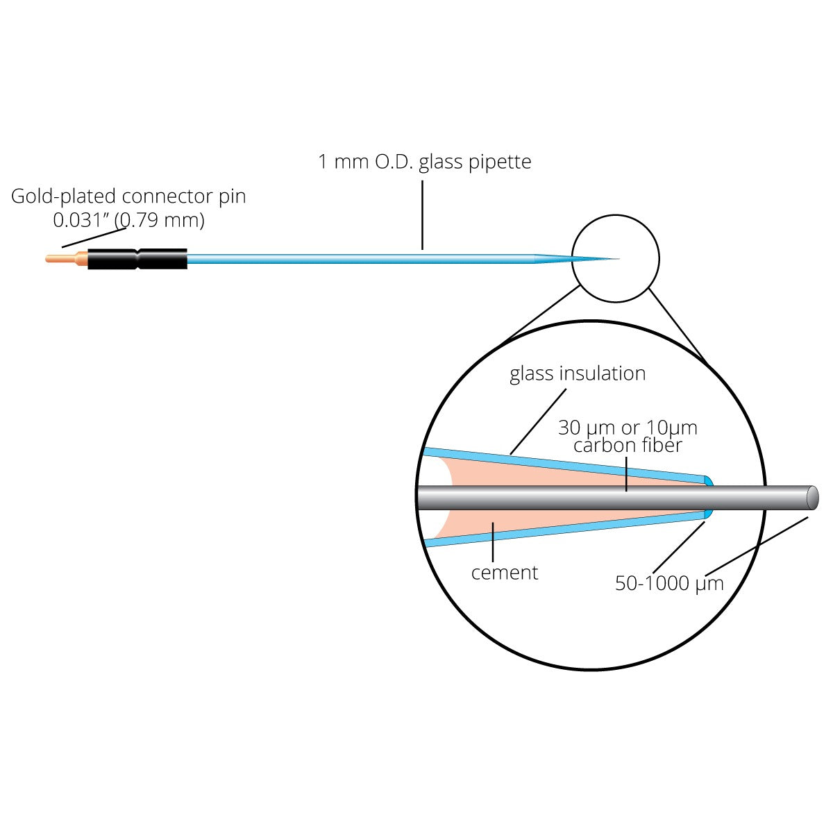 Carbon fiber microelectrodes have been used in both the detection of oxidizable compounds (Gonon, et al., 1978; Cahill and Wightman, 1995) and extracellular single-unit recording (Armstrong-James and Millar, 1979). WPI™s ultra-sensitive and low-noise carbon fiber (CF) electrodes can be applied, with our Micro-C Potentiostat or similar instruments, in the electrochemical detection of catecholamines (epinephrine, norepinephrine and dopamine), indolamines (serotonin, 5-HT or melatonin), Fe (II) and other oxidizable compounds.