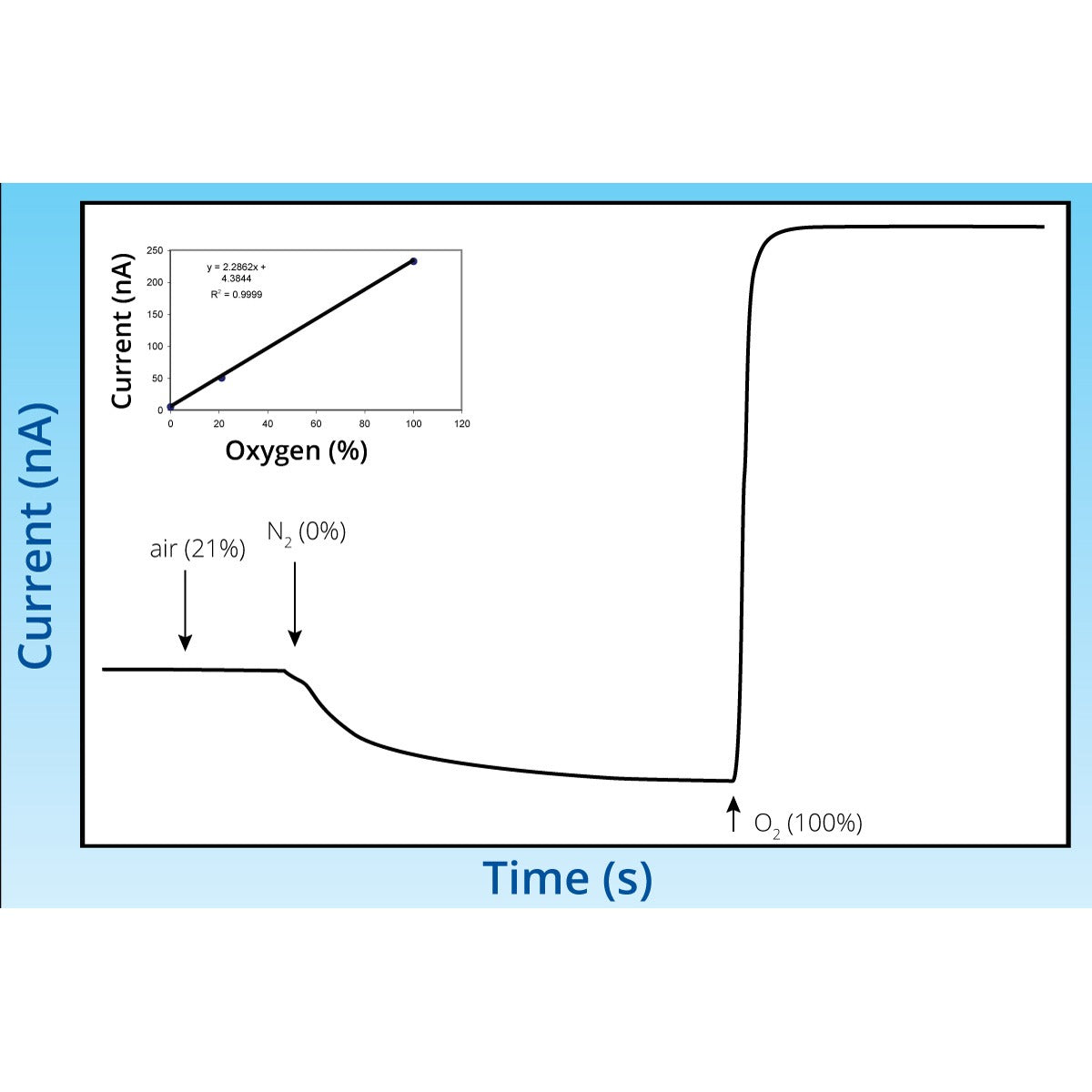 Oxygen diffuses through the membrane. The voltage applied to the sensor is held at -0.7V when the monitoring device is on and the sensor is properly connected. The magnitude of the generated electrical current is determined by the rate of diffusion through the membrane. The rate is proportional to the partial pressure of oxygen outside the membrane. The current serves as a measure of the partial pressure of O2.