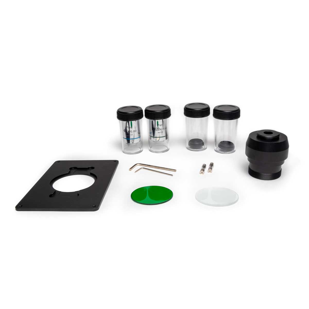 Accessories included: Green, blue and neutral filters, dust cover, immersion oil, manual and warranty card.