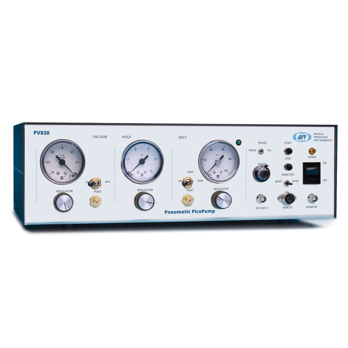 Eject pressure supplies a high-pressure pulse for injecting fluid. Hold pressure, which is not sufficient to cause fluid ejection, is used to prevent back filling of the pipette by capillary action or diffusion when the solenoid is inactive. Vacuum can be applied through the ejection port, but vacuum in the PV820 must be externally regulated. To fill pipettes from the tip or through a secondary port to secure a floating cell during microinjection, vacuum may be switched from regulated vacuum to atmosphere by using the switch on the front panel.