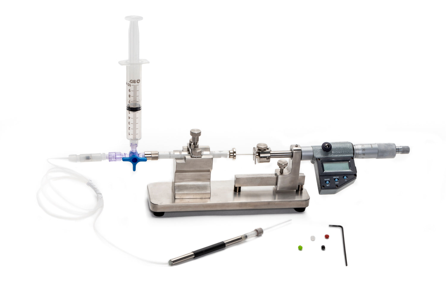 The entire frame body of the injector is constructed with stainless steel for excellent stability and durability. The piston of the micrometer can be slid across the rail to the syringe's plunger position. Small diameter PTFE tubing is used to improve the accuracy and solution compatibility. The unique design of the pipette holder can securely hold any pipette with an outer diameter of between 1.0 mm and 1.5 mm. All necessary accessories for removing air and filling the syringe and tubing with liquid are included. The system comes complete with a 100 µL gas tight syringe and other syringe sizes may be purchased separately.