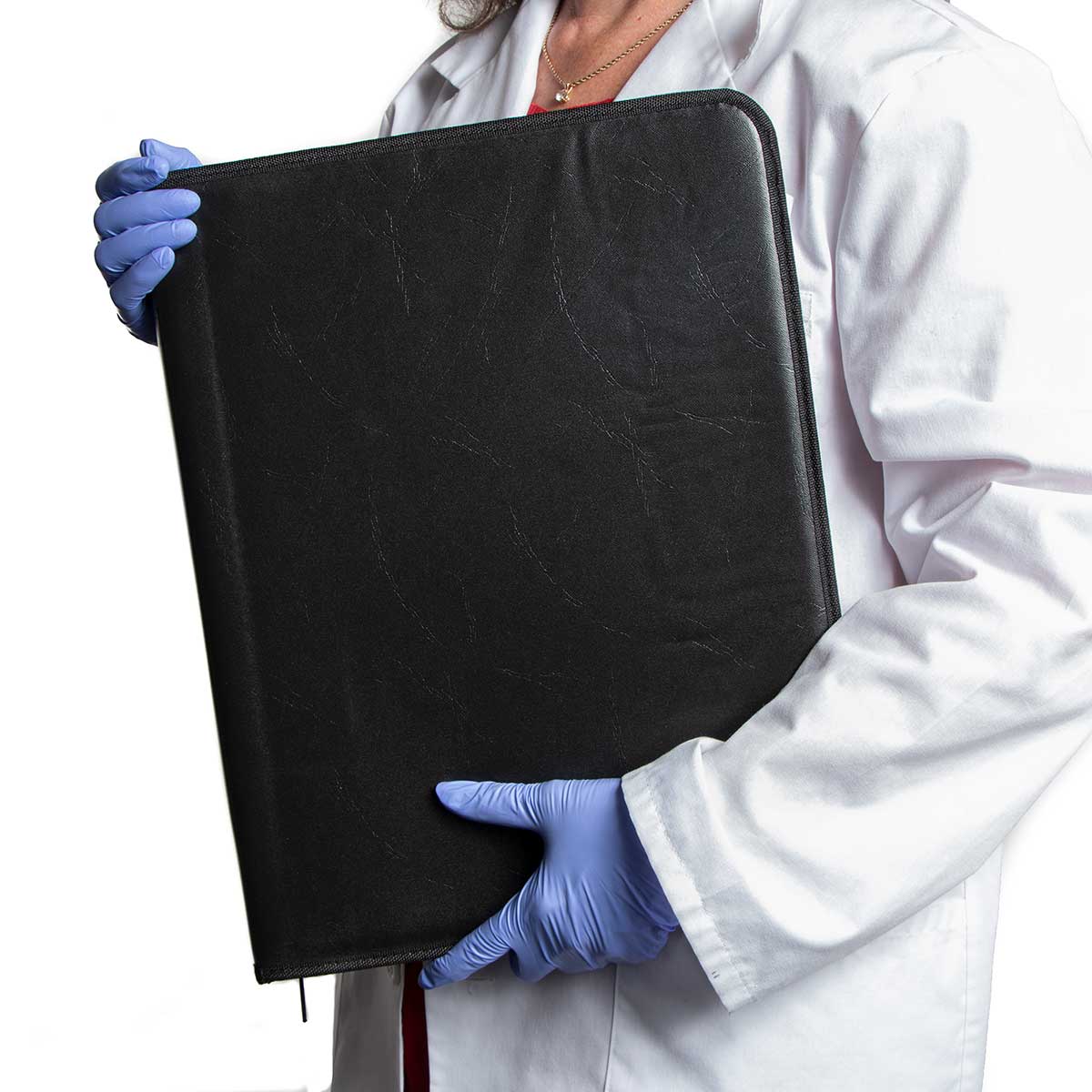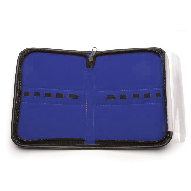 Store your surgical instruments in style. Elastic bands hold surgical instruments and surgical tools in place against soft velveteen fabric. Portfolio folds in half and zips closed. Large portfolio holds up to 40 instruments and the small portfolio holds up to 10.