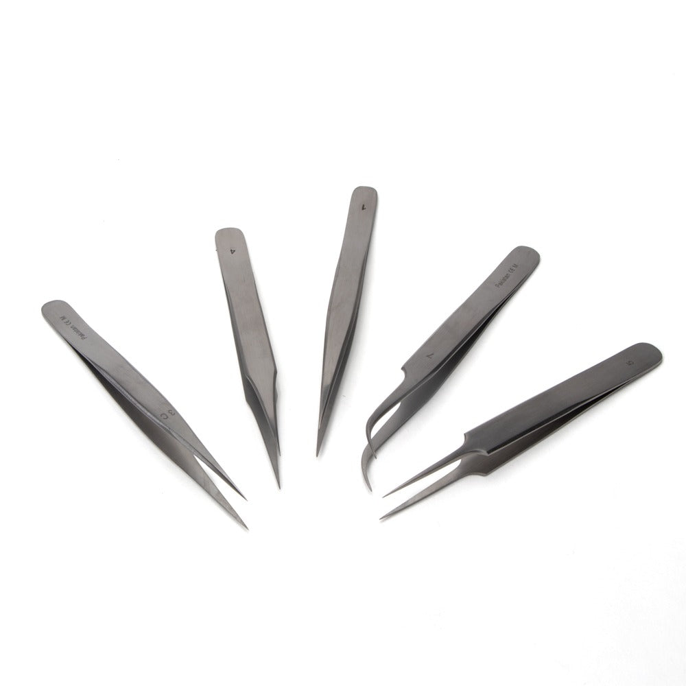 #5 Tweezers, like the number 4, are 11 cm long with fine, sharp tips that measure 0.40 x 0.45 mm. The shanks are thinner and taper to a sharp point. These are the most popular style of tweezers.