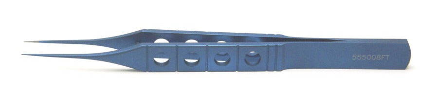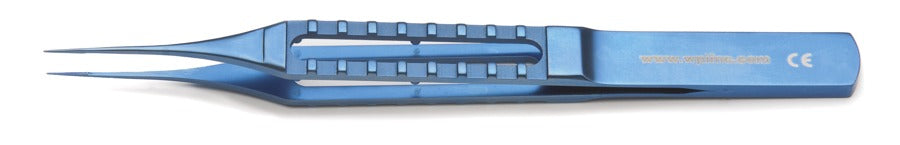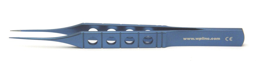 WPI Titanium Forceps with Tying Platform are straight forceps 11.5 cm (4.5") long, and they come with 4 mm, 5 mm or 6 mm tying platforms. Forceps with a tying platform are designed to grasp, and manipulate tissues or objects during surgical procedures. They flat tying platform is near the tips where suture can be tied. This gives you a stable area for suturing or ligating. The slender handles are textured for a firm grip, and the hole patterns in the handle makes the instrument incredibly lightweight. All three sizes are made of titanium, which is 40% lighter than stainless steel. Titanium is 100% non-corrosive, great for researchers doing seawater procedures. Titanium is 100% non-magnetic, making it MRI compatible. The tips also have tungsten carbide inserts for increased gripping power. The anodized, non-glare blue finish is perfect for work under surgical lamps or microscopy applications. These forceps are autoclavable and sterilizable by chemical sterilant.